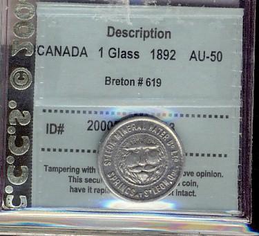 Breton #619, graded CCCS AU-50. St Leon Water, Good for 1 Glass 1892. Beautiful token.