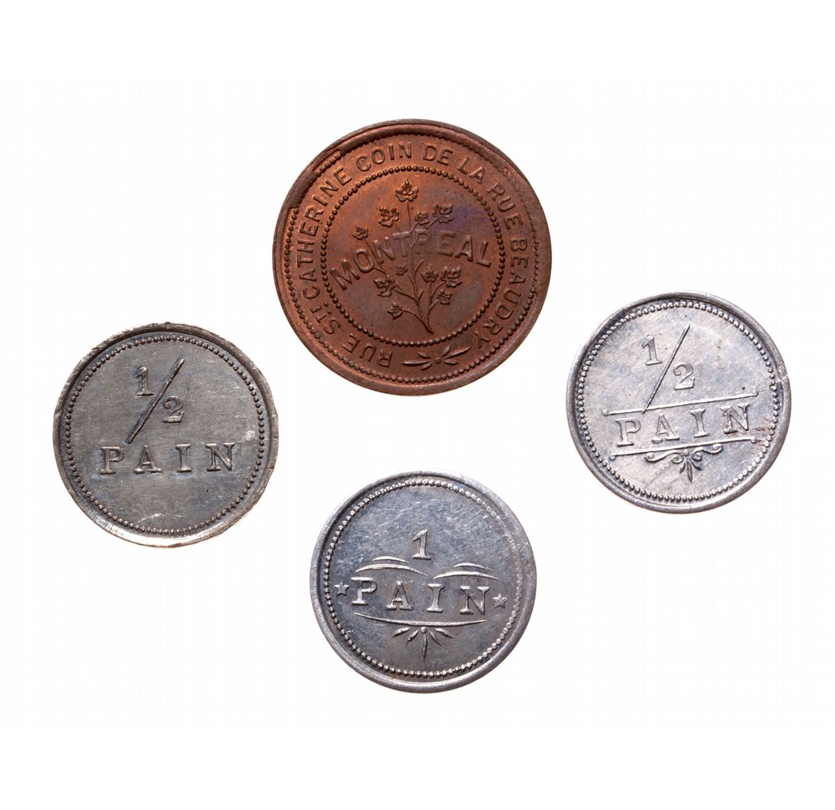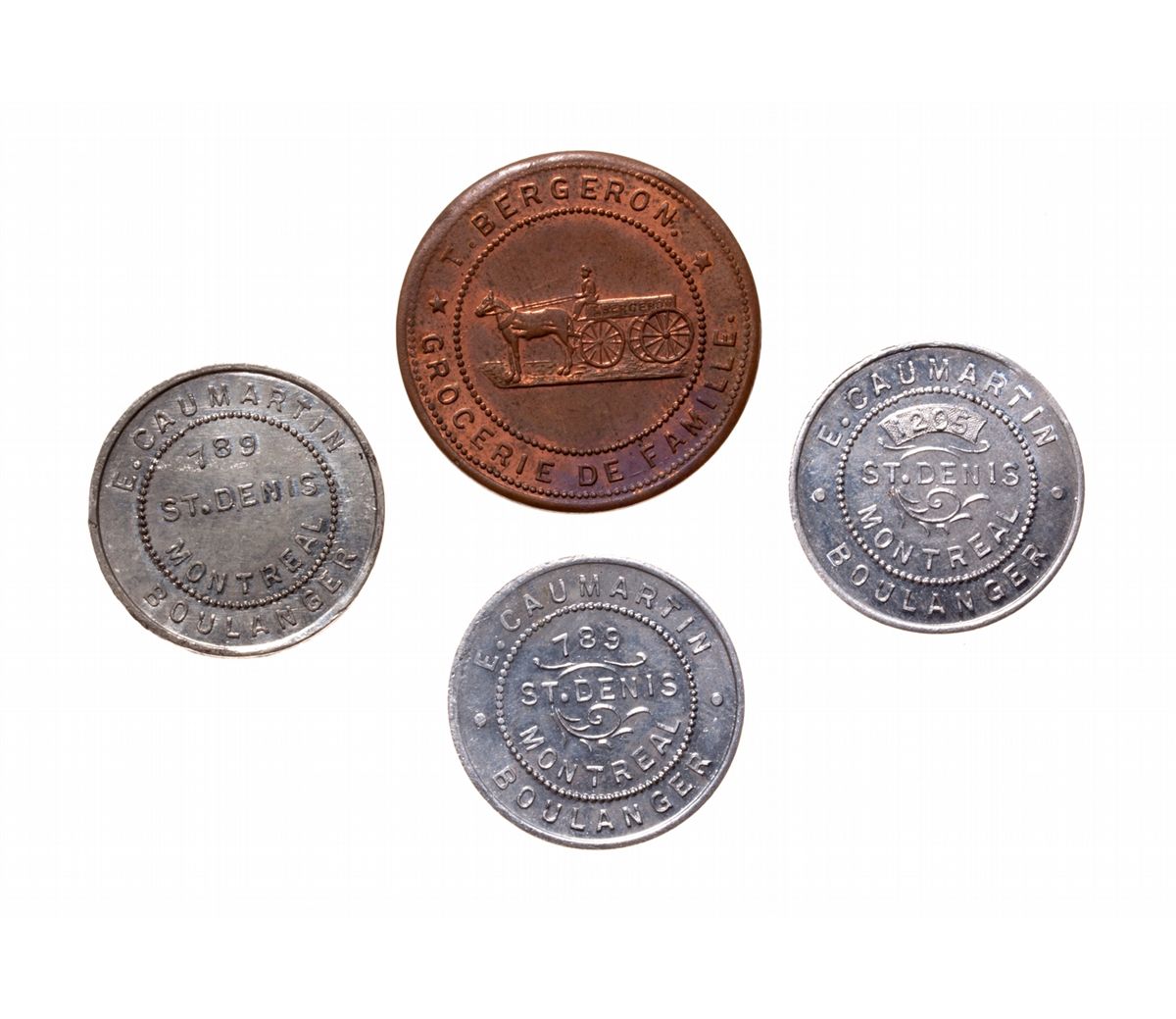 Breton-655. T. Bergeron. Montreal. Copper. 30% luster; Breton-657, (2 pcs.); Breton-628. E Caumartin. All AU or better. Lot of four (4) tokens.