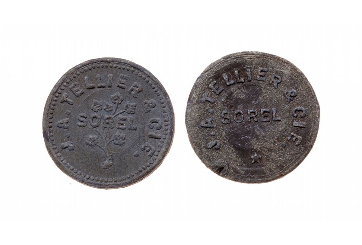 Breton-661. J.A. Tellier. Sorel. Lead. Breton-662. J.A. Tellier. Jug. On reverse. Pewter. Both Very Fine or better.