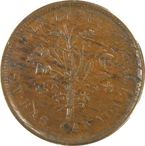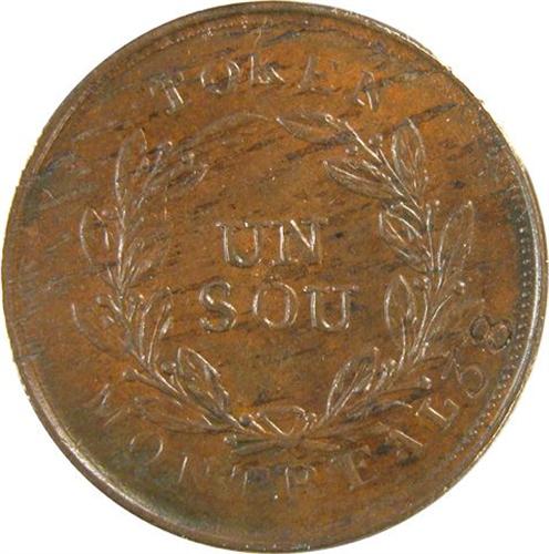 Canada Pre-Confederation Token. Breton 694, Bouquet Sou - Eighteen Cherry Leaves, Five Shamrocks, Bow, Two Blades, CH LC-31C, Cornwell AU+, Counterstamped 38. A sharp example with much remaining lustre and some planchet striations. There is a small 38 counterstamped near the rim at 4 oclock