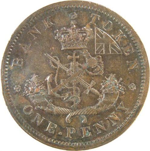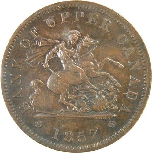 Canada Pre-Confederation Token. Breton 719, 1857 Bank of Upper Canada One Penny, CH PC-6D, Cornwell AU+. A very sharp and near fully lustrous example