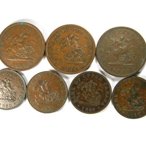 Breton 719 Bank of Upper Canada Penny, 1850 PC-6A1, EF, 1852 Large 2 Heaton, PC-6B5, VF and 1857 PC-6D, EF. Plus Breton 720 Bank of Upper Canada Halfpenny, 1850 PC-5A two pieces, EF and EF-AU, 1852 Royal Mint PC-5B1, VF-EF and 1857 PC-5D, EF. Seven tokens