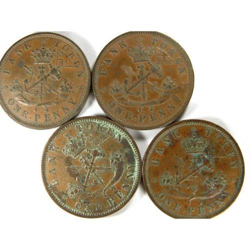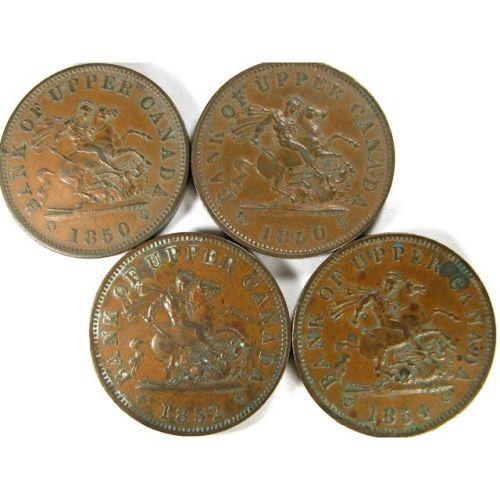 Breton 719. Group of Bank of Upper Canada Pennies: 1850 Without Dot, PC-6A1, 1850 With Dot, PC-6A2, 1852 Large 2, Heaton, PC-6B5 and 1854 Crosslet 4, PC-6C2. Total four pieces, all EF