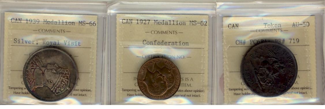 Breton 719, PC6B4 ICCS AU50. Also includes 1939 Medallion Silver, Royal Visit ICCS MS66 & 1927 Medallion Confederation ICCS MS62.