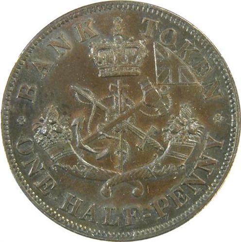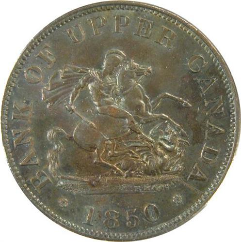 Canada Pre-Confederation Token. Breton 720, 1850 Bank of Upper Canada Half Penny, CH PC-5A, Cornwell Unc+. This is a well struck piece with strongly lustrous and rather flawless brown surfaces with pale golden overtones
