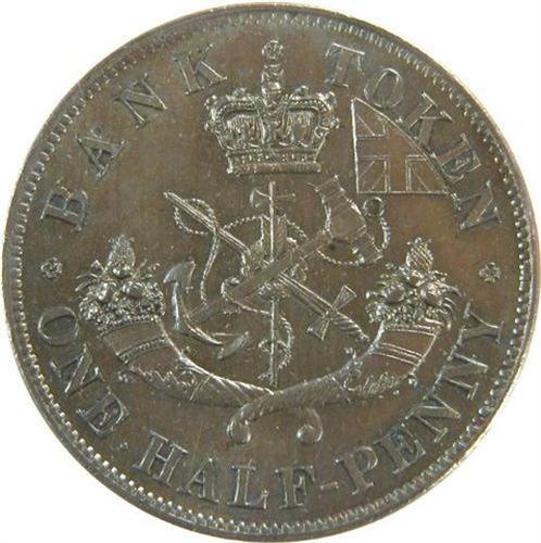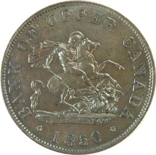 Canada Pre-Confederation Token. Breton 720, 1850 Bank of Upper Canada Half Penny, CH PC-5A, ICCS MS-63. This is a well struck piece with strongly lustrous and rather flawless brown surfaces with pale golden overtones