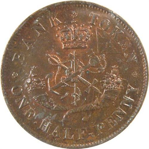 Canada Pre-Confederation Token. Breton 720, 1857 Bank of Upper Canada Half Penny, CH PC-5D, ICCS MS-63, Lacquer. A fully struck example with strong lustre and about 40% remaining red
