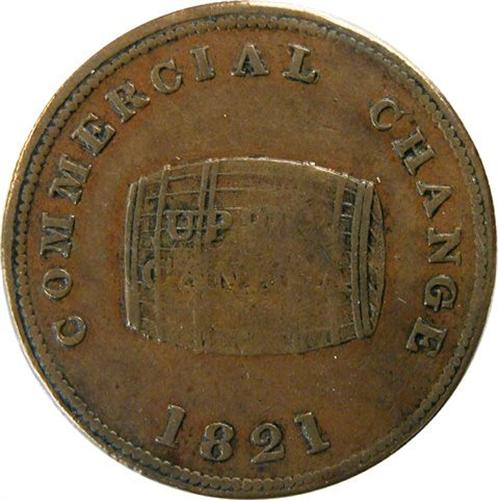 Canada Pre-Confederation Token. Breton 728, 1821 Commercial Change, Cask marked Upper Canada, CH UC-10, Cornwell EF. Ex Jeffrey Hoare Auction Fall 1989, Lot 2247. A very nice example, seldom offered better