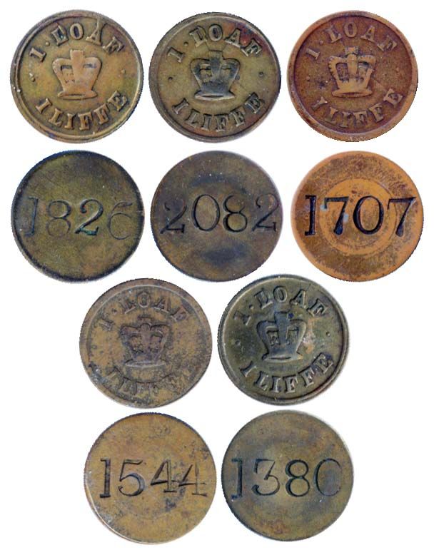 ILIFFE 1 Loaf. No. 1380 on reverse. Brass. VF; Another, No. 1544 on reverse. VF; Another, No. 1707 on reverse. Another, No. 1826 on reverse. VF; No. 2082 on reverse. VF. Lot of five (5) tokens.