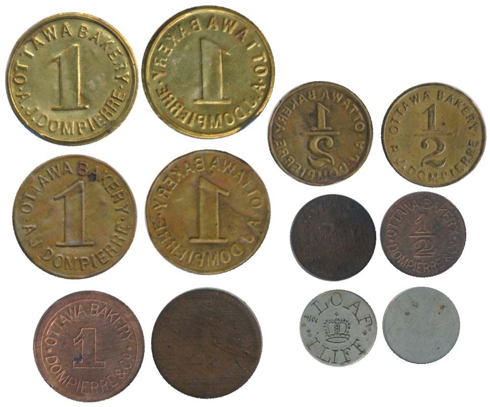 Astwood-1215b. ILIFFE. 1/2 Loaf. White metal. Incuse. EF; Breton-737. Astwood-1205d. Ottawa Bakery. 1 Loaf. Brass. EF; Breton-737. Ottawa Bakery. 1 Loaf. Brass. No periods after 'A' and 'J'. VF; Breton-737a. Ottawa Bakery. 1 Loaf. Incuse. Brass. EF; Breto