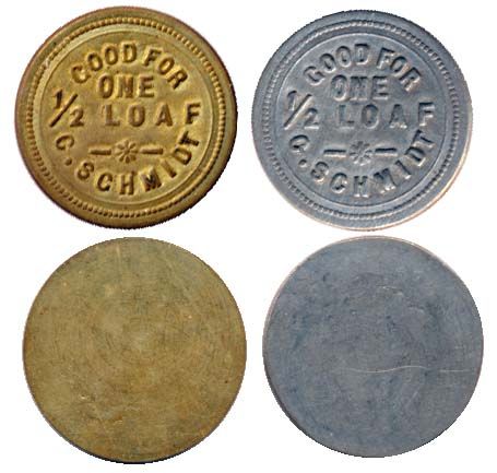 C. Schmidt. 1/2 Loaf. Brass; Another, White metal. Lot of two (2) tokens, both AU or better.