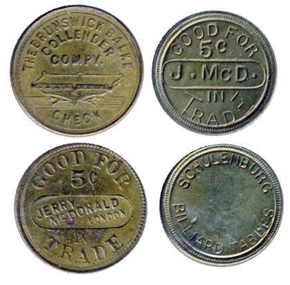 Jerry McDonald. London, Ont. 5 Cents. No stars. Brass; Breton-757d. Bo-596-o-d. J. McD. 5 Cents. Incuse. Brass. Lot of two (2) tokens, both AU or better.