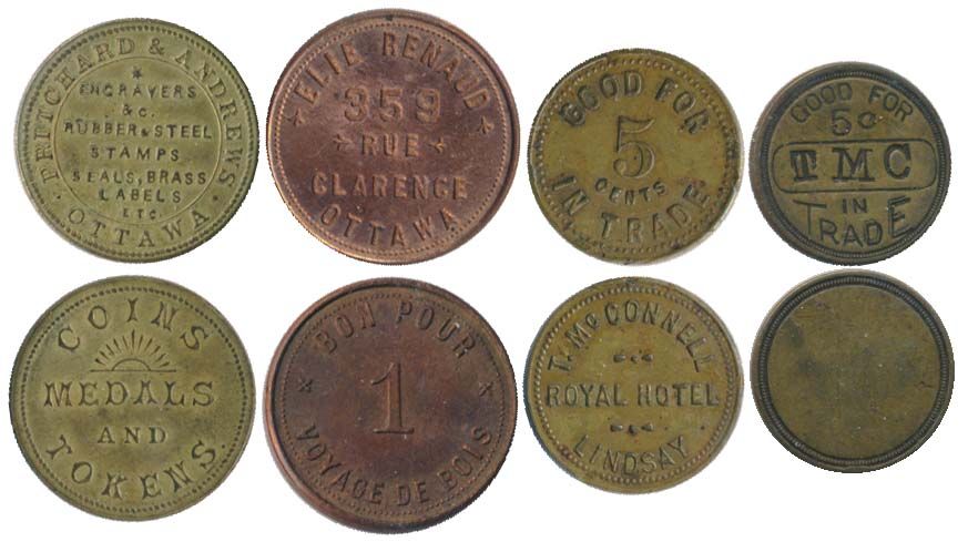 Bo-572-A-C. T. McConnell. Royal Hotel. 5 Cents. Brass. Breton-764c. Bo-572-A-E. T.M.C. 5 Cents. Incuse. Brass; Breton-769. Elie Renaud. 1 Voyage de Bois. Brass. Breton-772. Pritchard & Andrews Coins. With star. Brass. Lot of four (4) tokens, all AU or bet