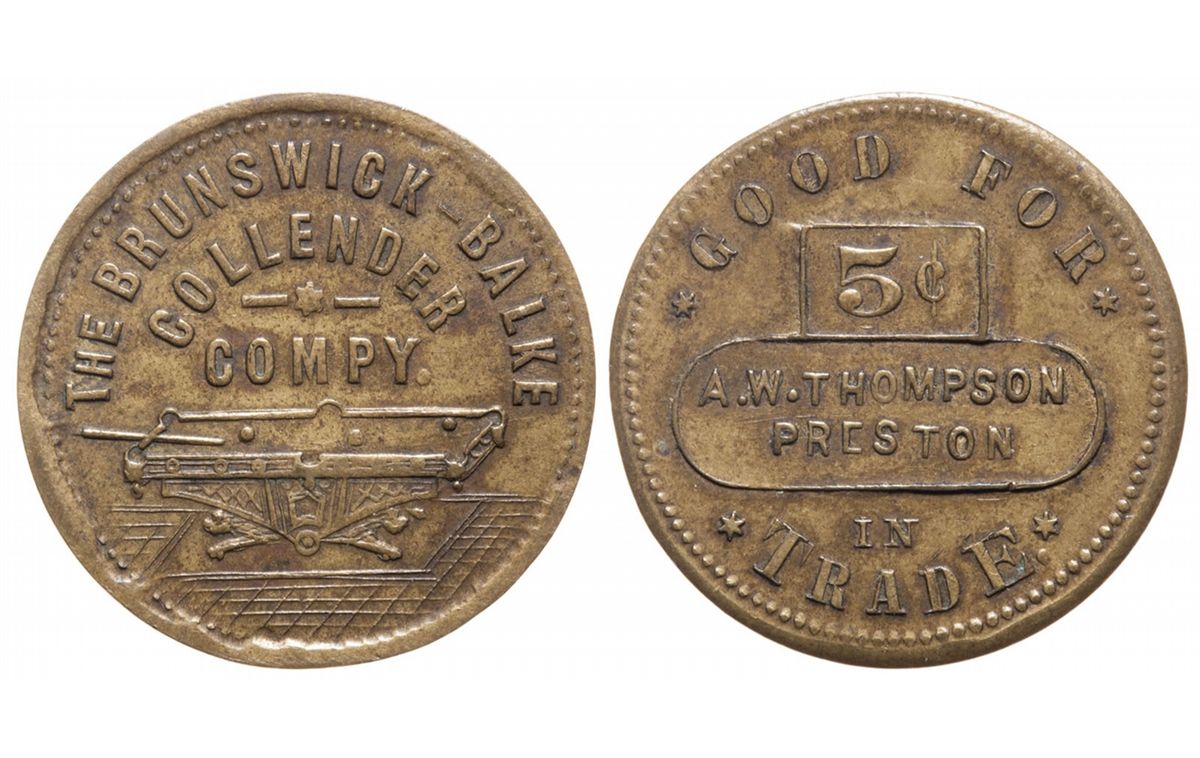 A.W. Thompson. (Small). Preston, Ontario. 5 Cents. Brass. Extra Fine.