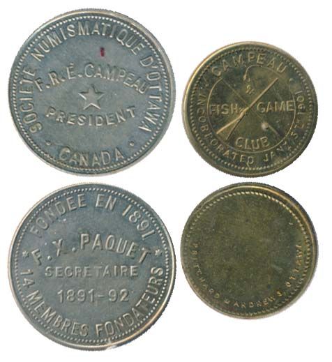 Societe Numismatique. Ottawa. 1891-92. Nickel; Breton-825c. Bo-1320c. Campeau Fish & Game. Brass. Lot of two (2) tokens, both AU.
