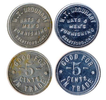 W.T. Urquhart. 5 Cents. Brantford, Ont. Aluminum; Another, German Silver. Lot of two (2) AU tokens.