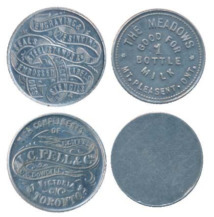The Meadows. 1 Bottle milk. Aluminum; Breton-842a. I.C. Fell. 67 Victoria St., Toronto. Aluminum. Both AU.