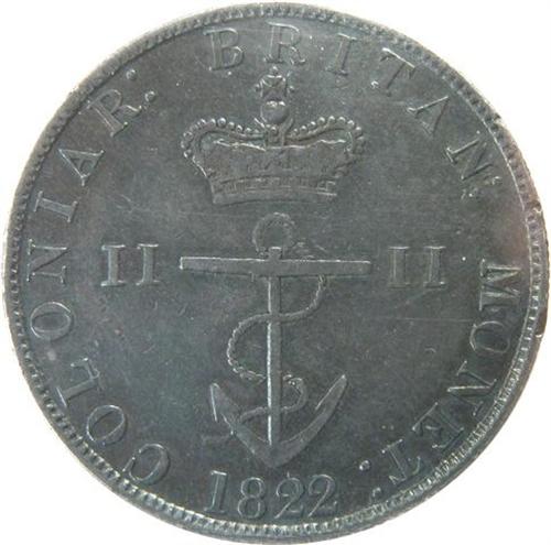 Canada Pre-Confederation Token. Breton 857, Anchor Coinage, British West Indies, 1822 1/2 Dollar, CCCS VF-30. A sharp example with some remaining lustre in the protected areas and a light-medium gun-metal toning