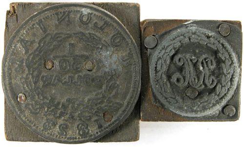 Breton 861, Colonial 1/50 Dollar 1825 and Breton 991, RH 1812 Farthing. Total two pieces, both Cast White Metal Printing Plates for the reverses and mounted on wooden blocks