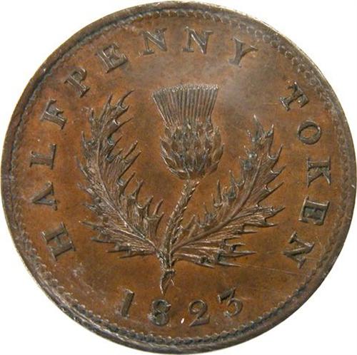 Canada Pre-Confederation Token. Breton 867, 1823 Nova-Scotia, Half Penny, Thirteen Leaves, CH NS-1A4, ICCS AU-55. This is a very sharp and near fully lustrous example