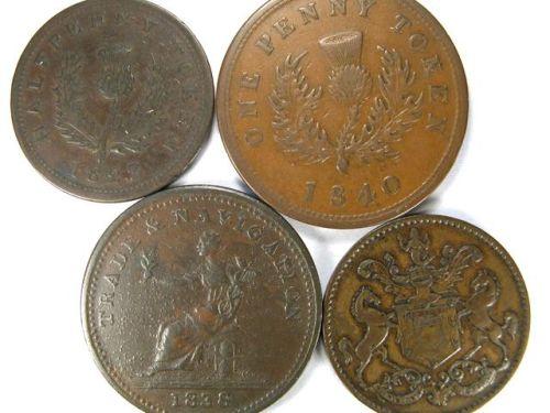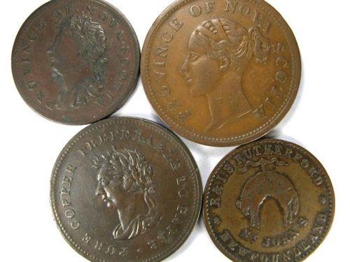 Breton 867, 1823 Nova Scotia Half Penny, NS-1A4, VF, Breton 873 1840 Nova Scotia One Penny Token, NS-2C1, VF, Breton 967 1838 Trade & Navigation, NS-22, EF and Breton 952 Undated Rutherford, NF-1A1, VF. A total of four tokens