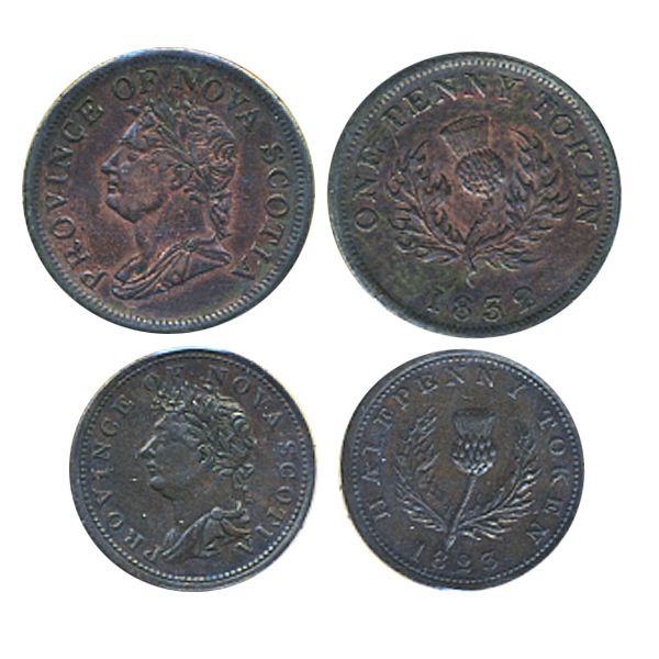 NS-1A4. 1823. 1/2 Penny. Thirteen leaves. ICCS Extra Fine-45; Breton-870. NS-2B2. 1832. 1 Penny. Bow near head. ICCS Extra Fine-45. Lot of two (2) tokens.