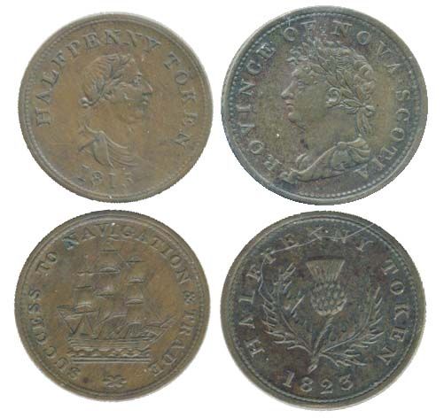 NS-1A3. 1/2 Penny. 1823. ICCS Extra Fine-40; Breton-888. NS-23A4. Success to Navigation & Trade. 1815. 1/2 Penny token. ICCS Extra Fine-40. Lot of two (2) tokens.