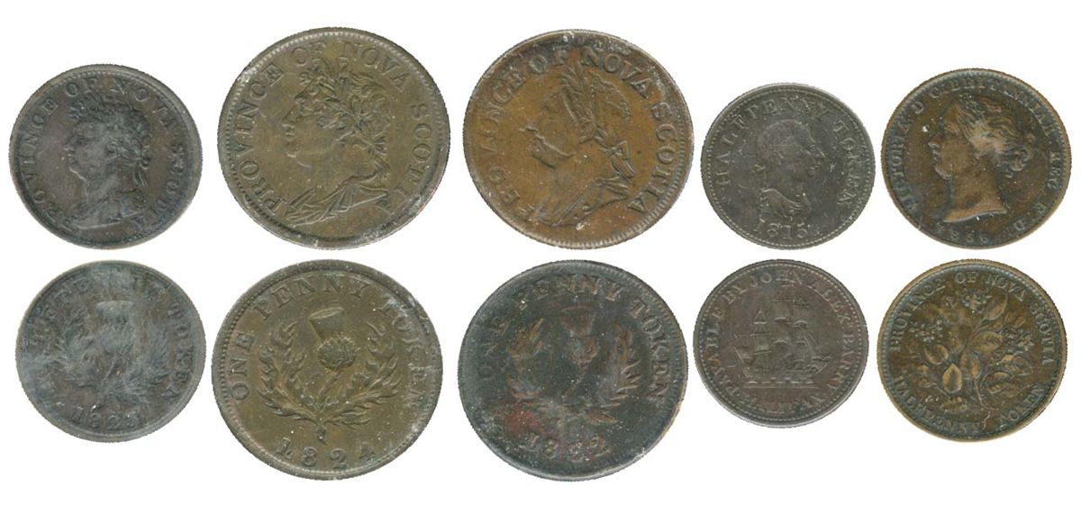 NS-1A. 1/2d. 1823. Breton-868. NS-2A4. 1d. 1823; Breton-870. NS4A4. 1d. 1832. Breton-876. NS-5A1. 1/2d. 1856. Breton-891. NS-14A5. Lot of five (5) token, all Very Fine.