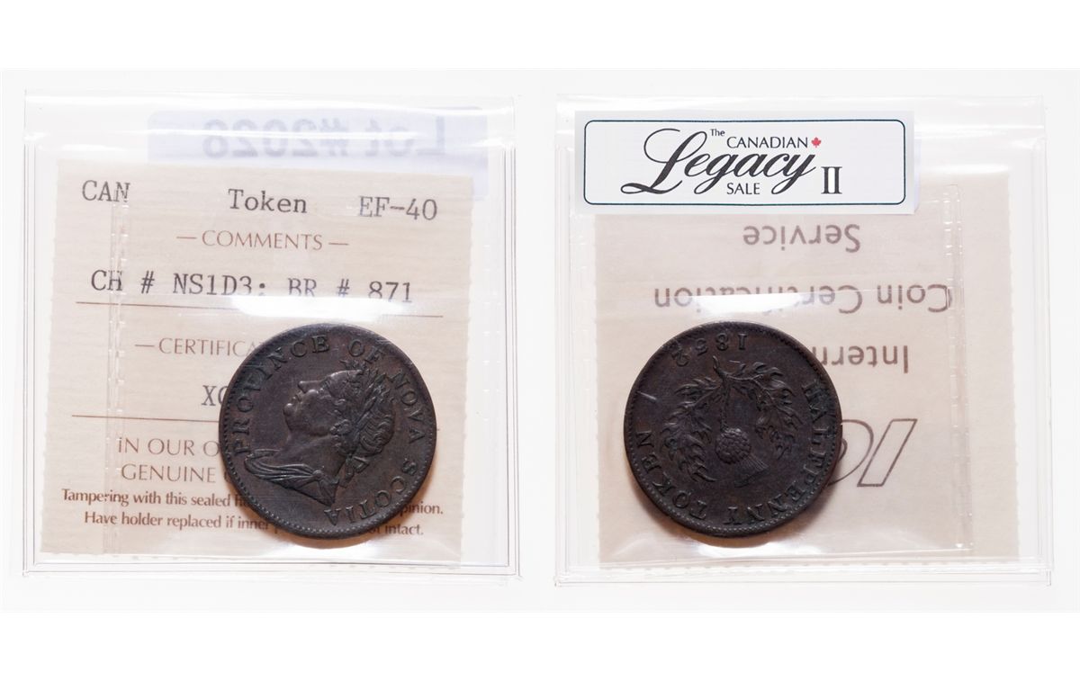 Breton-871. NS-1D3. Canada. 1/2 penny token. 1832. Equal Ribbons. ICCS graded Extremely Fine-40.