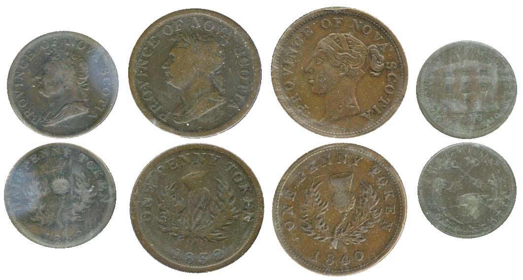 NS-1D2. 1/2d. 1832. Breton-870. NS-2B2. 1d. 1832; Breton-873. NS-2C1. 1d. 1840. Breton-892. NS-15A. 1816. Wholesale & Retail Hardware Store. Lot of four (4) tokens, all Very Fine.