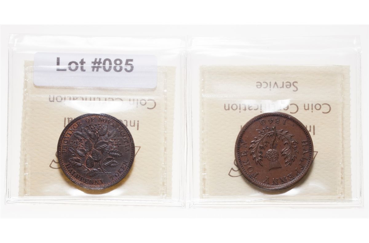 Breton-874. NS-1E2. 1/2 Penny Token. 1840. ICCS Extra Fine-45; Breton-876. NS-5A1. 1/2 Penny Token. 1856. ICCS Mint State-60. Lot of two (2) tokens.
