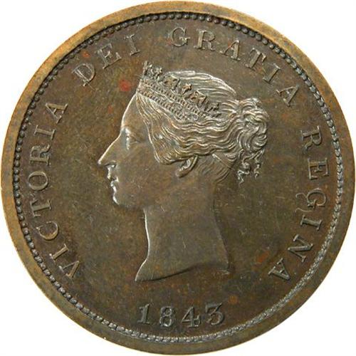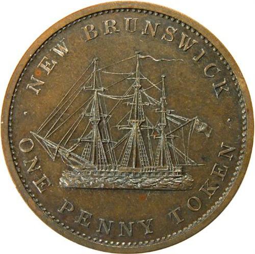Canada Pre-Confederation Token. Breton 909, 1843 New Brunswick One Penny Token, CH NB-2A, Very Choice Proof. This is a very attractive piece with a full proof strike offering cameoed devices on mirrored fields, which have a profusion of fine die polishing striations. It has great lustre and near flawless brown surfaces with light gun-metal blue overtones