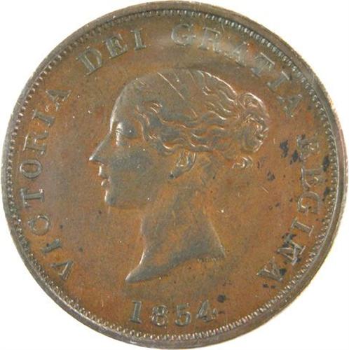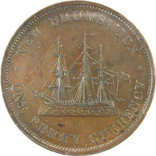 Canada Pre-Confederation Token. Breton 911, 1854 New Brunswick One Penny Currency, Incomplete Ensign, CH NB-2B2, ICCS EF-40. A sharp example