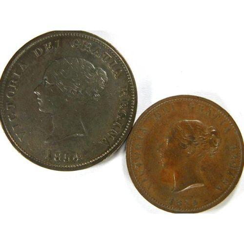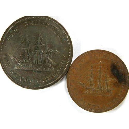 Breton 911 New Brunswick 1854 Penny, Incomplete Ensign, NB-2B2 and Breton 912 New Brunswick 1854 Halfpenny, NB-1B, both EF