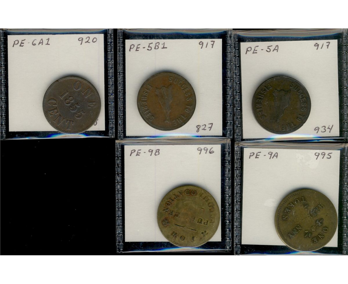 Breton 917 PE-5A, PE-5B1, PE-6A1, PE-9A & PE-9B. Lot of 5 tokens VG to VF for grades.