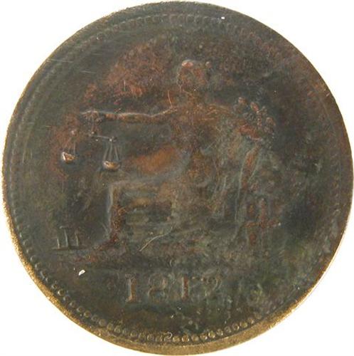 Breton 961, 1812 Imitation Tiffin Token, Clockwise Wreath, CH LC-48C2, Silly Bust, Nine Chaplet Leaves, Thighs Longer than Calves, Four Cannon Balls, TF-07, ICCS MS-60. A scarce example, rated as R6