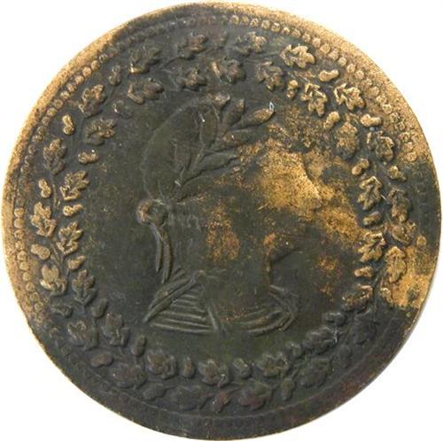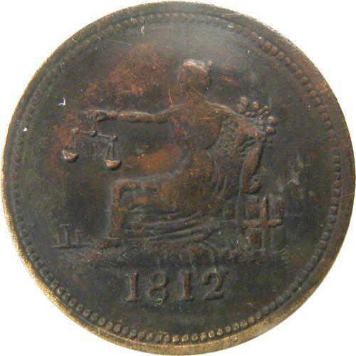 Canada Pre-Confederation Token. Breton 961, 1812 Imitation Tiffin Token, Clockwise Wreath, CH LC-48C2, Silly Bust, Nine Chaplet Leaves, Thighs Longer than Calves, Four Cannon Balls, TF-07, ICCS MS-60. This piece has the typical soft strike from crude dies. Listed as R6 in Ingram