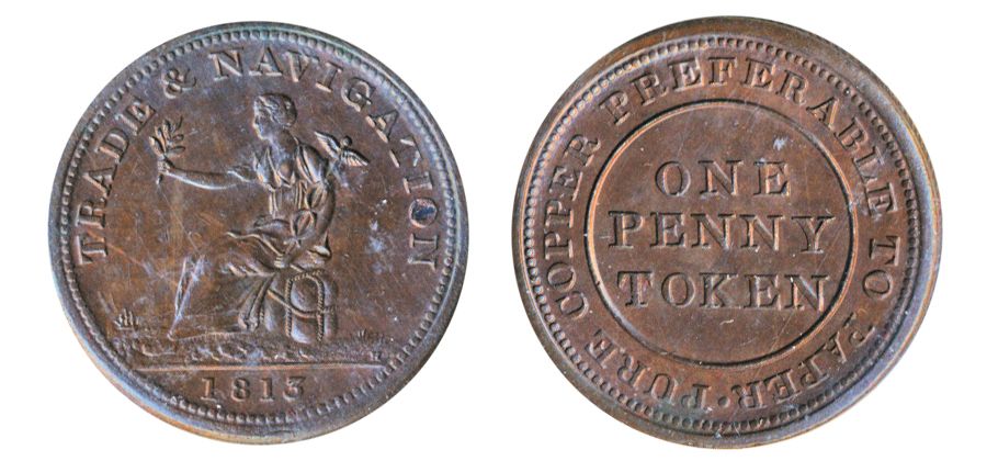 Breton-962. NS-20A3. Trade & Navigation. One Penny Token. 1813. ICCS Mint State-60.