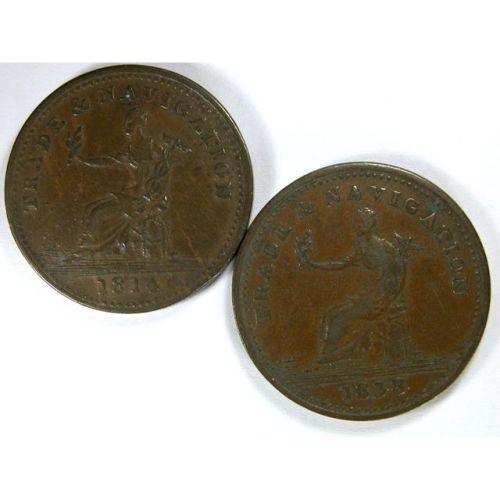 Breton 962 Trade & Navigation 1814 Penny, Plain Edge, NS-20B3, and Breton 967 Trade & Navigation 1838 Penny, NS-22, both VF-EF