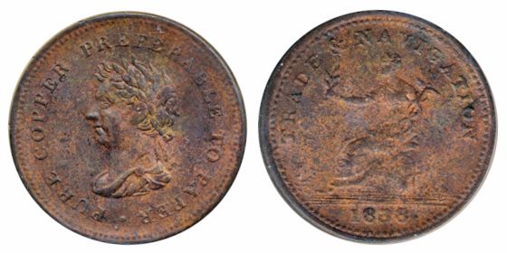Breton-967. NS-22. Trade & Navigation. 1838. Pure Copper Preferable to Paper. ICCS Mint State-60. 20% red luster.