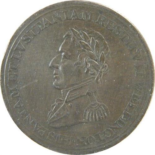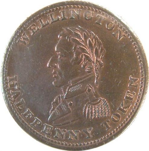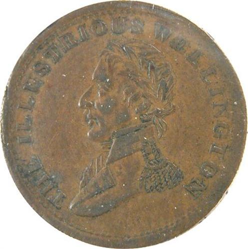 Canada Pre-Confederation Token. Breton 979, 1814 Wellington Half Penny Token, Middle Tine Barbed, CH WE-8A1, ICCS VF-30 Cleaned. Plus Breton 981, 1816 Waterloo Half Penny, Ten Strings, CH WE-10A1, ICCS VF-30 and Breton 986, Peninsular Token, CH WE-11B2, ICCS EF-45, Scratch
