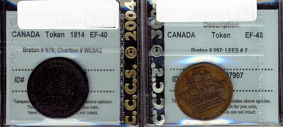 Breton #979, Charlton #WE8A2, Wellington token and Breton #997, Charlton #PE10-7 Ship Colonies & Commerce Token. Lot of 2 coins both graded CCCS EF-40.