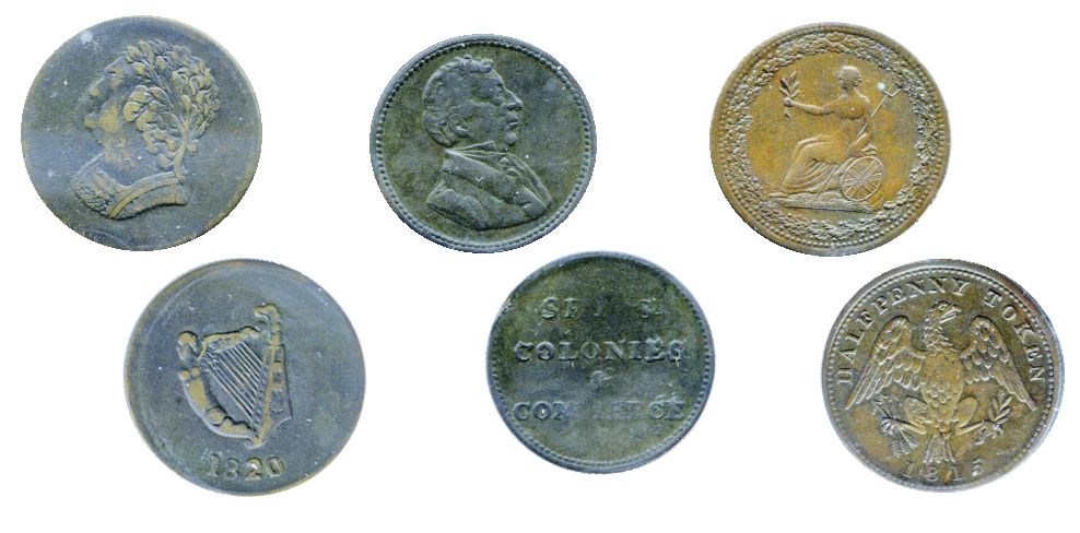 Breton-994. LC-54D2. Half Penny Token. 1815. Clockwise wreath. ICCS Extra Fine-45; Breton-1002. LC-58A1. Bust. Ships, Colonies & Commerce. ICCS Very Fine-20; Breton-1012. LC-60C1. Bust & Harp. 1820. ICCS Very Fine-30. Lot of three (3) tokens.