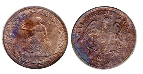 Breton-994. LC-54D2. Half Penny Token. 1815. Clockwise wreath. ICCS Mint State-62. Red. 60% luster.