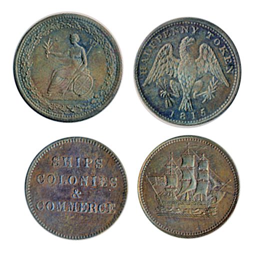 LC-54D. 1815. 1/2 Penny. Clockwise Wreath. Unc; Breton-997. PE10-31. Lees-31. Ships, Colonies & Commerce. British Flag. AU. Lot of two (2) tokens.