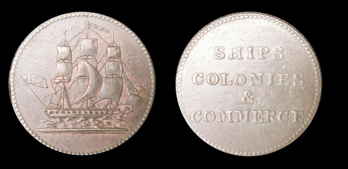 Breton #997, Charlton #PE10-2, graded EF+. Ship Colonies & Commerce Token with USA flag and without W & B NY.