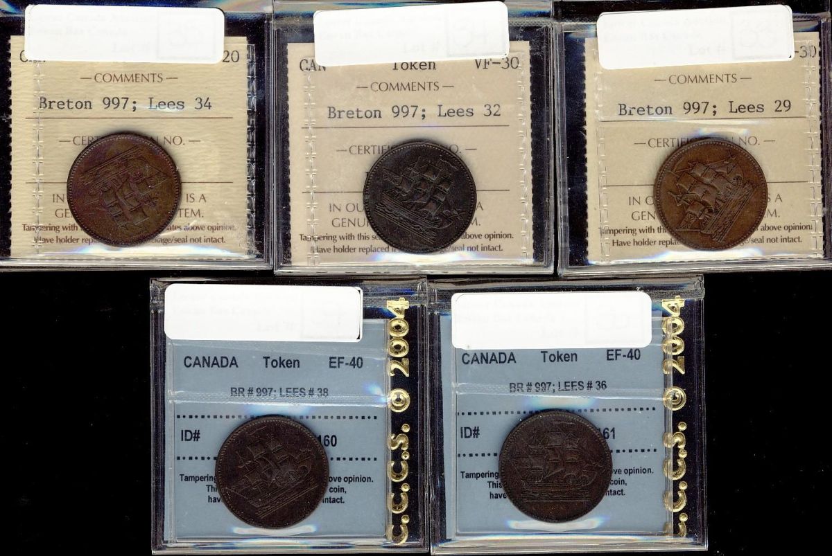 Breton #997, Charlton #PE10-29 CCCS VF30 PE10-32 ICCS VF30, PE10-34 ICCS VF20, PE10-36 & PE10-38 CCCS EF40. Lot of 5 coins. Ship Colonies & Commerce Token.
