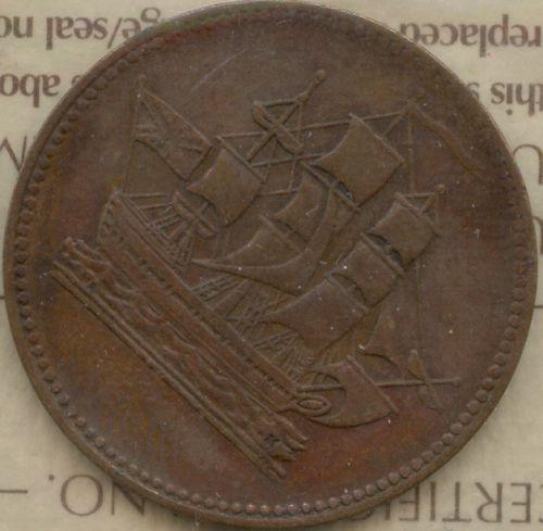 Breton 997, Charlton PE10-43 ICCS certified VF-30. Double H Mintmark, British Flag Straight, Round Knob Ampersand, Yard of unfurled sprit-sail beyond sail, Weakly struck "I" SHIPS and "L" of COLONIES. Long Die Crack from rim through COM and ampersand. Ex