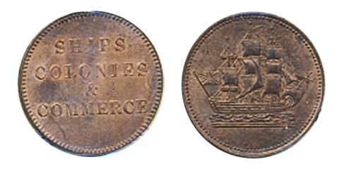 PE10-31. Lees-31. Ships, Colonies & Commerce. ICCS Mint State-62. 50% red gold luster.