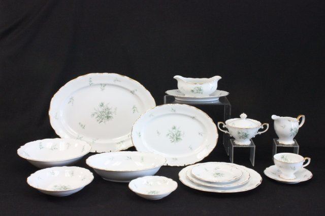 Including 10 dinner plates, 12 luncheon plates, 12 soup bowls, 12 small bowls, gravy dish, 12 dessert plates, 12 saucers, creamer & sugar dish.